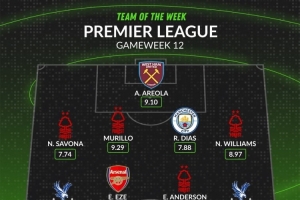 WhoScored英超第12轮最佳阵容:埃泽、鲁本·迪亚斯在列,森林4人