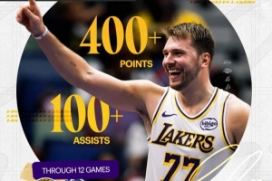 此役过后,东契奇本赛季出战12场已达成400分100助,成为历史上单赛季达此数据最快的球员。